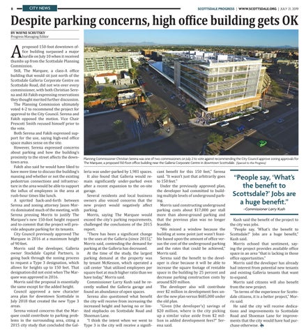 leria was under-parked by 1,981 spaces. It also found that Galleria would remain signi�icantly under-parked even after a recent expansion to the on-site garage. Several residents and local business owners also voiced concerns that the new project would negatively affect parking. Morris, saying The Marquee would exceed the city’s parking requirements, challenged the conclusions of the 2015 report. “There has been a signi�icant change to the uses at the Galleria (since 2015),” Morris said, contending the demand for parking at the Galleria has decreased. At the time of the study, the largest parking demand at the property was by tenant McKesson, which operated a call center “that utilized employees per square foot at much higher ratio than we have today,” Morris said. Commissioner Larry Kush said he recently walked the Galleria garage and found an abundance of open spaces. Serena also questioned what bene�it the city will receive from increasing the increased height and having no or limited stepbacks on Scottsdale Road and Shoeman Lane. “I think the intent when we went to Type 3 is the city will receive a signi�i-