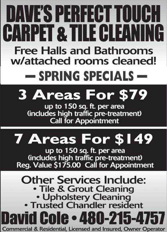 Our truck-mounted steam cleaning system will deep clean your carpets, ridding them of unwanted dirt, bacteria, fungus and chemical residues. Upholstery cleaning also available. Tile and grout cleaning. For a clean and healthy carpet, call 480-786-6610 or 602989-8311. John Downs, Owner/Operator, Ocotillo Resident. Call for monthly specials.