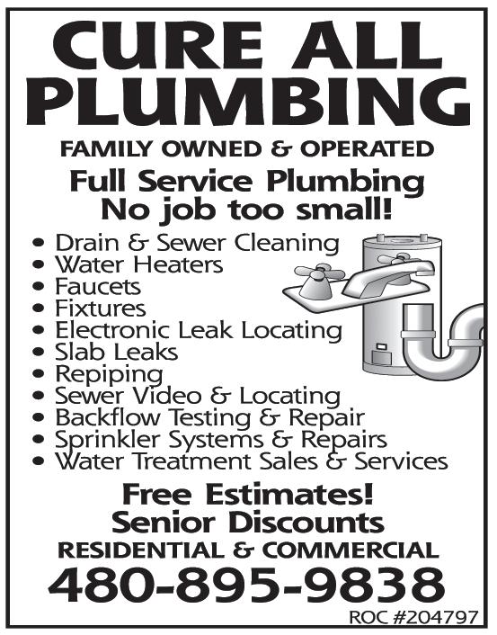 For all your plumbing needs! Free estimates and Senior Discounts! Water heaters, faucets, toilets, pipe leaks, garbage disposals, slab leaks, repiping, drain cleaning: Clogs, jetting, Camera inspection, locating. Water softeners, Reverse Osmosis systems. Sprinkler and Backflow repairs. Licensed, Bonded & Insured. Member of BBB. Cure All Plumbing 480-895-9838