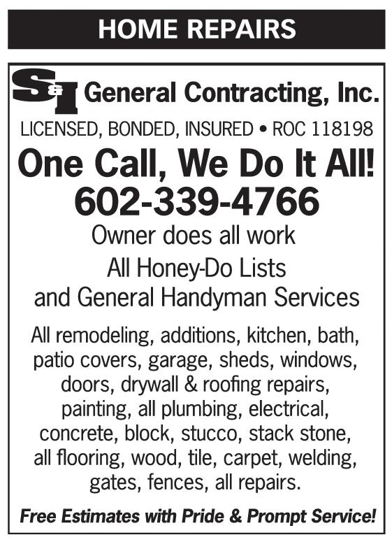 General Handyman Services. One Call, We Do It All! Owner does all work. Free Estimates with Pride & Prompt Service. Licensed, Bonded, Insured. ROC 118198. S&I General Contracting, Inc. Steve 602-339-4766.