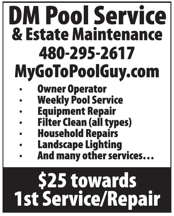 And Estate Maintenance. Owner Operator. Weekly Pool Service. Equipment Repair. Filter Clean (all types). Household Repairs. Landscape Lighting. Many Other Services. $25 towards 1st Service or Repair. 480-295-2617. MyGoToPoolGuy.com