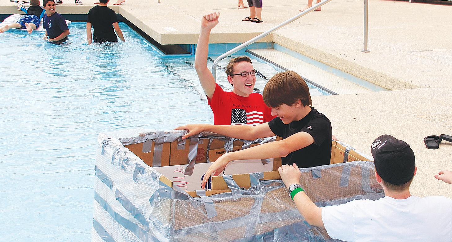 Team ‘Hi Mom’ cheers when their boat stays afloat at the Fremont Junior High Cardboard Boat Regatta.