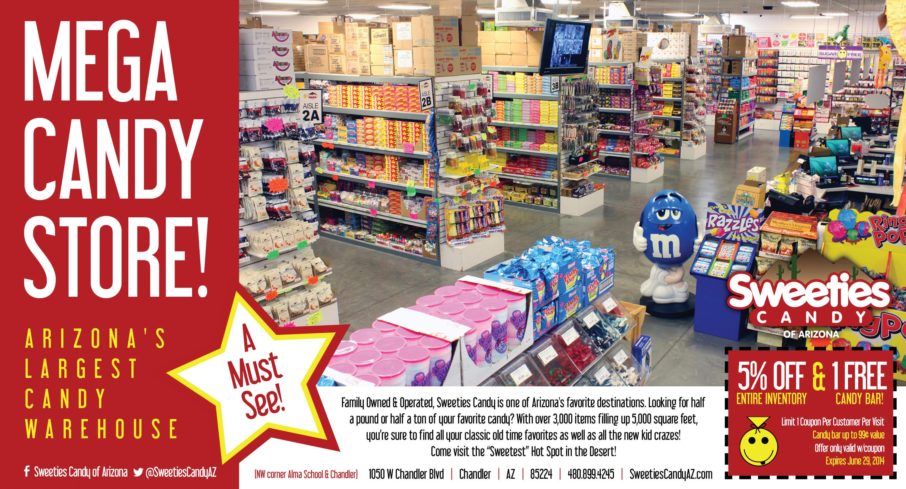 Sweeties Candy of Arizona is located at 1050 W. Chandler Blvd., Chandler. Sweeties is open 9 a.m. to 7 p.m. Monday through Saturday, closed on Sunday. For more information, call (480) 899-4245 or visit www. sweetiescandyaz.com.