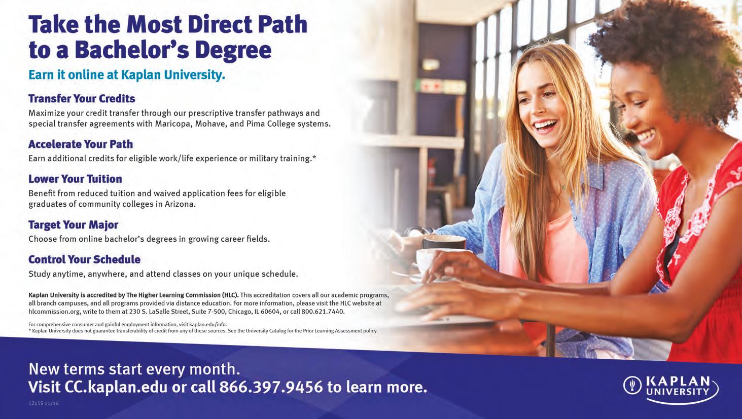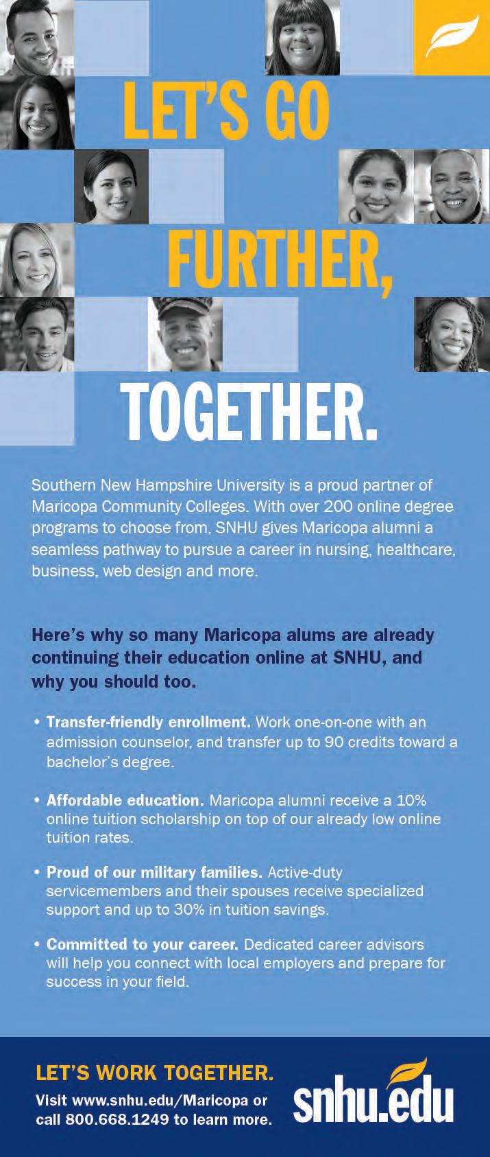 Students who know where they plan to transfer can also rely on university website transfer information. For University of Arizonabound students, “Utilizing the Degree Search site (degreesearch.arizona.edu), students can pull up the AZ Transfer Course Equivalents tab for a side-by-side comparison of every class that they can take at the Maricopa Community Colleges that will transfer directly into their chosen degree program,” says Brenna Secore, UA assistant director of transfer enrollment.