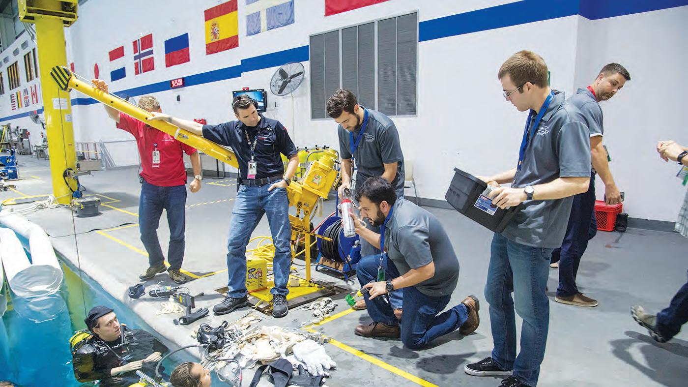 The devices were built to aid in one of three specific microgravity scenarios: collecting surface samples, collecting subsurface samples, and anchoring. Embry-Riddle’s Massive Aerospace Dynamics (MAD) team included students Farjam Ashrafzadeh, William Hosea, and Daniel Griffith—accompanied by faculty advisor Professor Richard Mangum—who travelled to Houston, Tex. to put their prototype to the test in NASA’s Neutral Buoyancy Laboratory—an underwater, micro-gravity simulated environment.