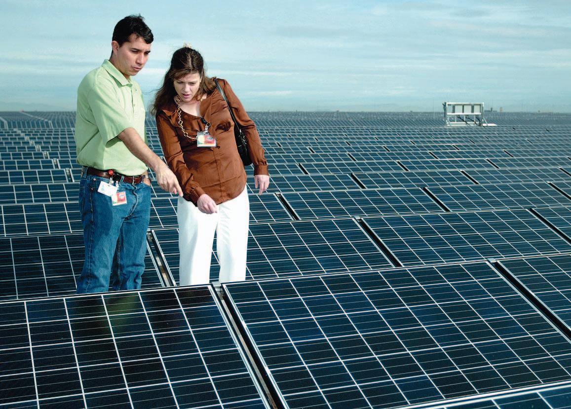 SRP engineer Jerald “Chico” Hunter, left, discusses solar paneling on top of a Tolleson Gatorade facility with Solid Solar founder and former CEO Lori Glover during a press event in Tolleson in 2009. Gatorade was one of the first West Valley companies to embrace solar on such a large scale.