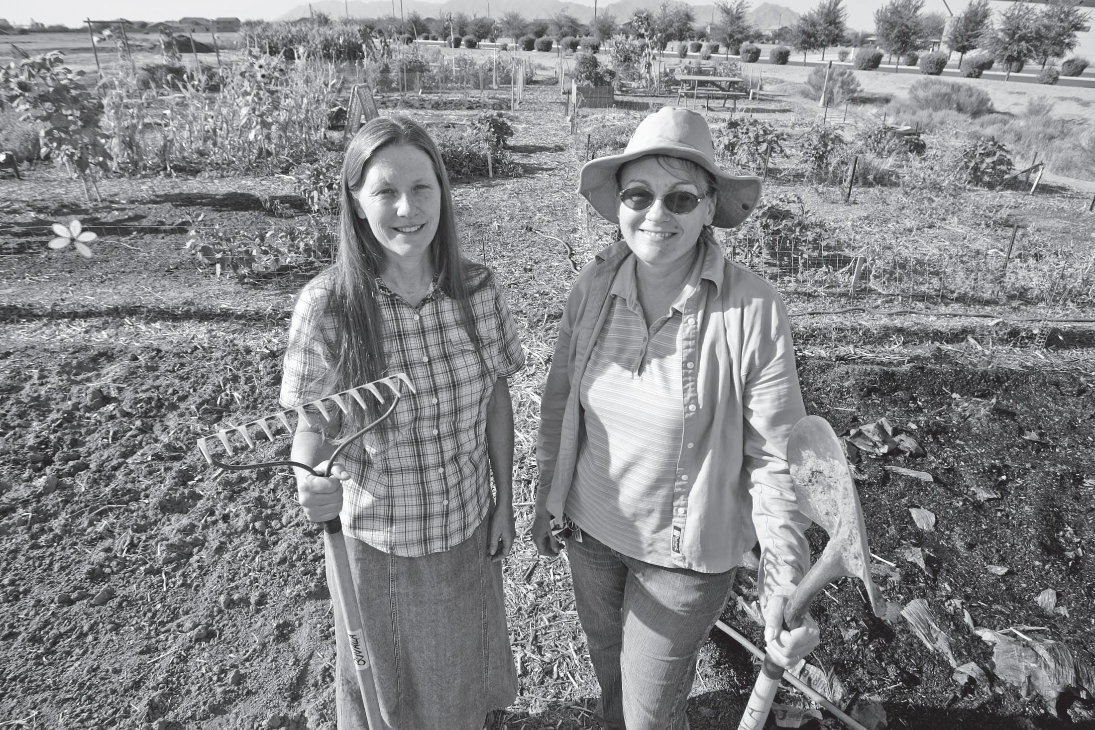Community gardeners Michelle Buvala, right, and Linda Ford take a break from tending to their vegetables in the Avondale community garden in Avondale.