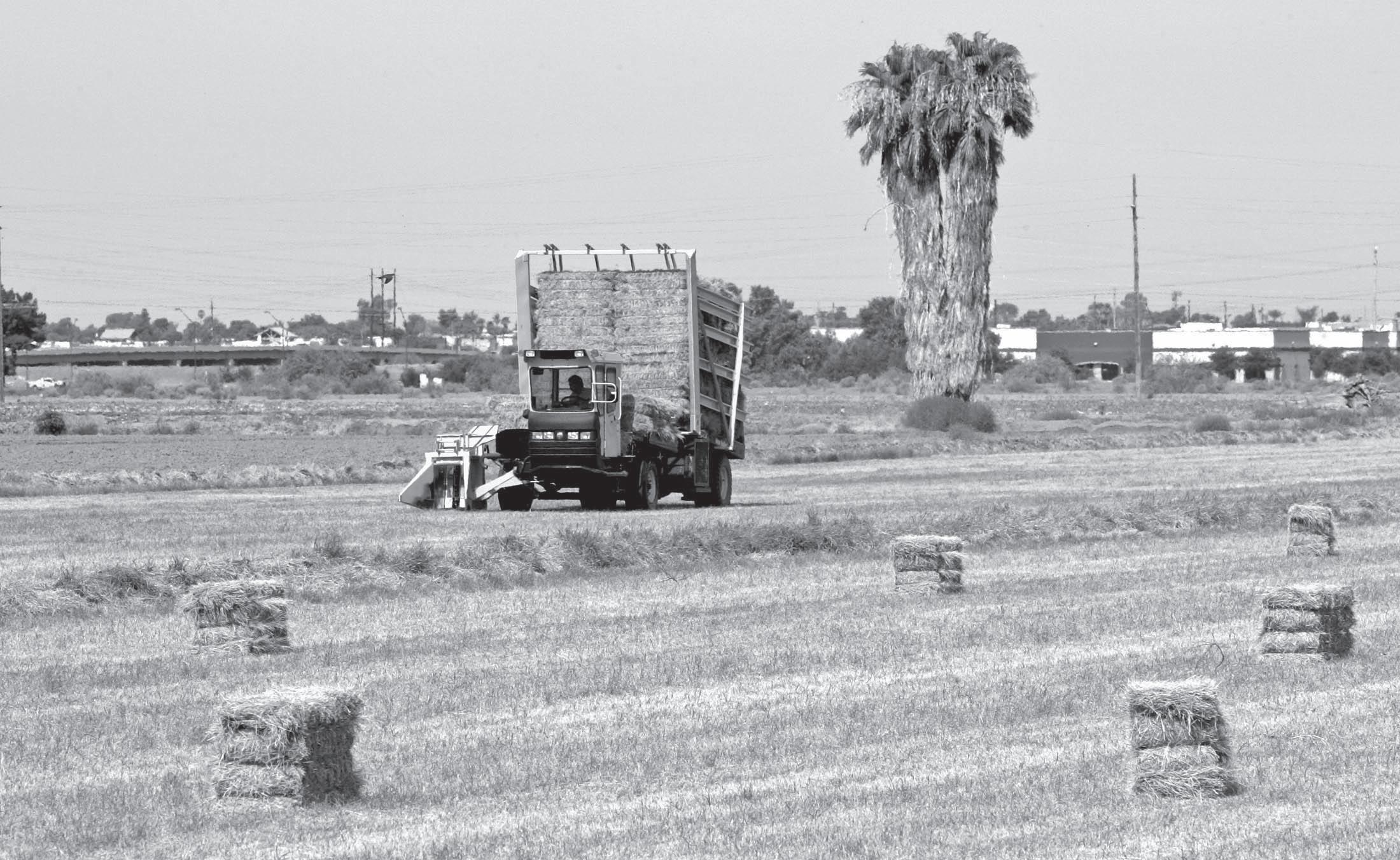 A farm machine picks up bales of hay that will be used as feed near Interstate 10 and Avondale Boulevard in Avondale. Even in the hot summer months fields still go to harvest in Arizona.