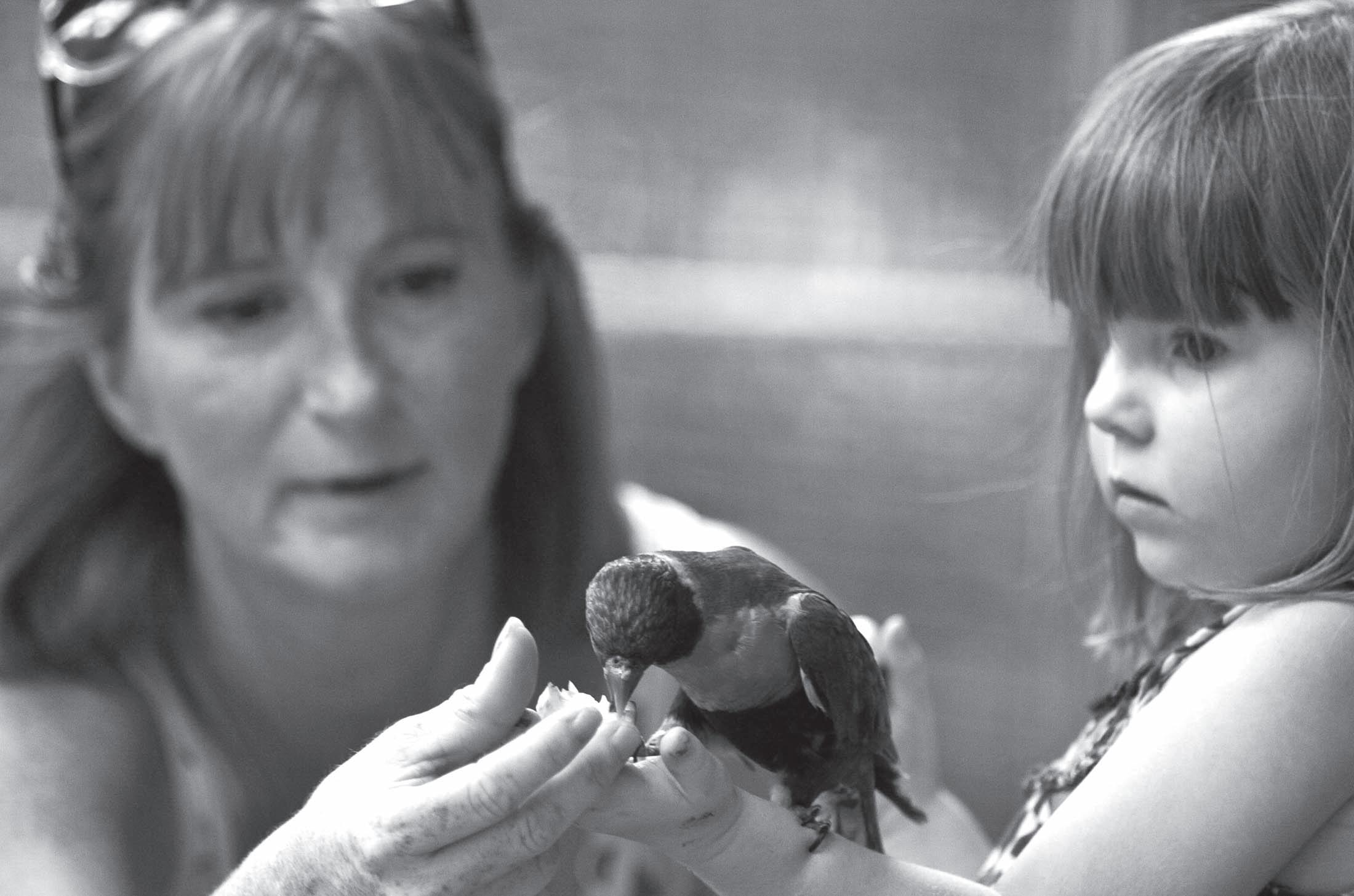 out slices of apples and holding them up eagerly as the rainbow-colored birds perched on her little arms.