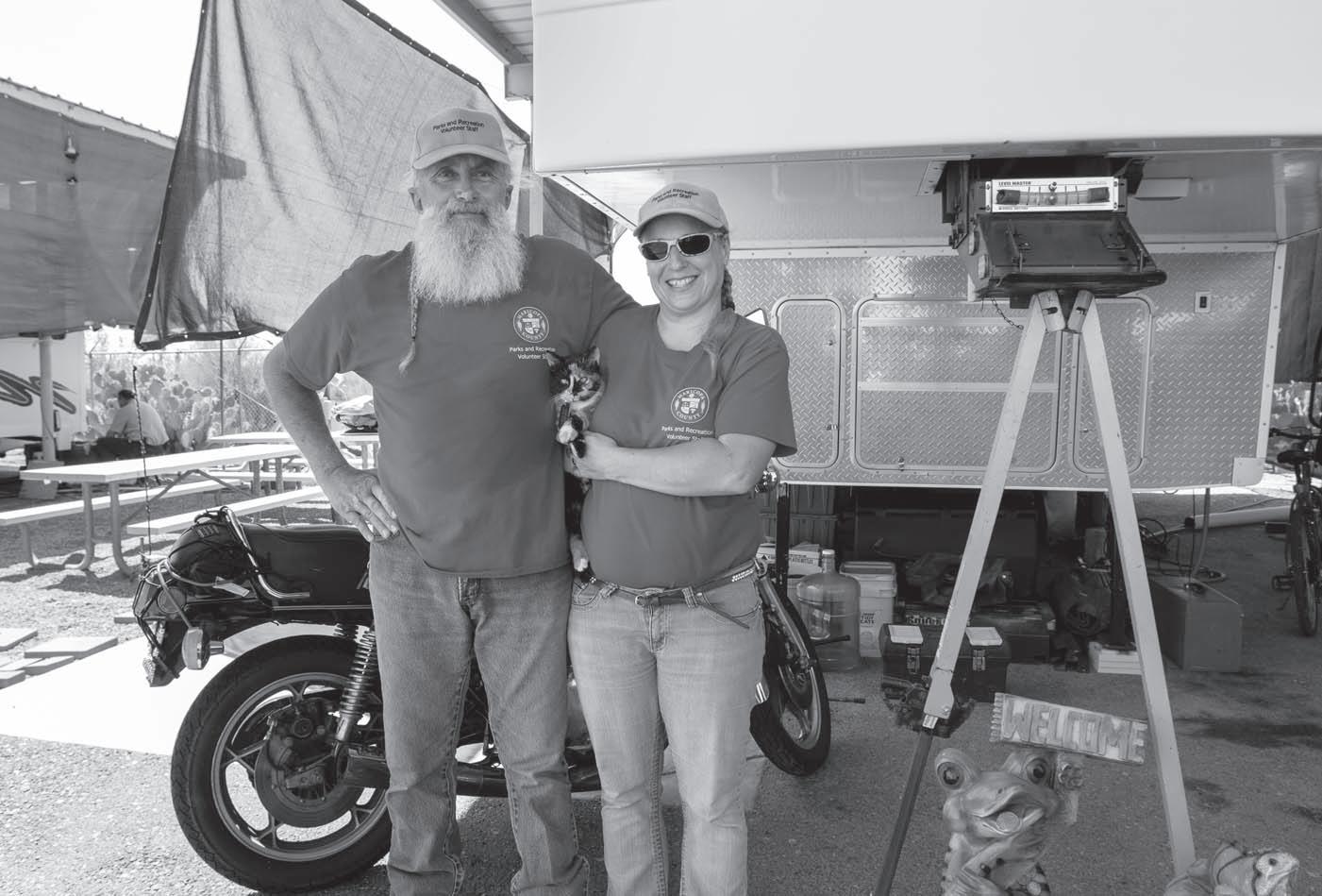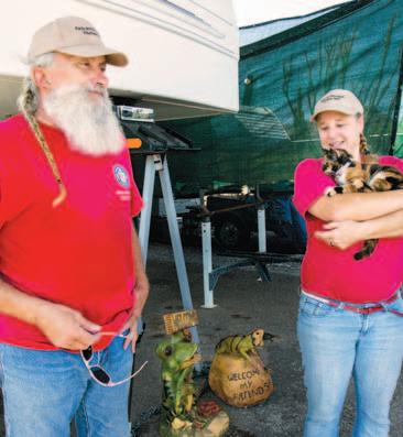 Vince Campbell and Amy Douglas, along with their cat Kaylee, are yearround camp hosts at White Tank Mountain Regional Park in Waddell. The park’s campground has sites with water and electric hookups and access to a dumping station, as well as primitive sites.