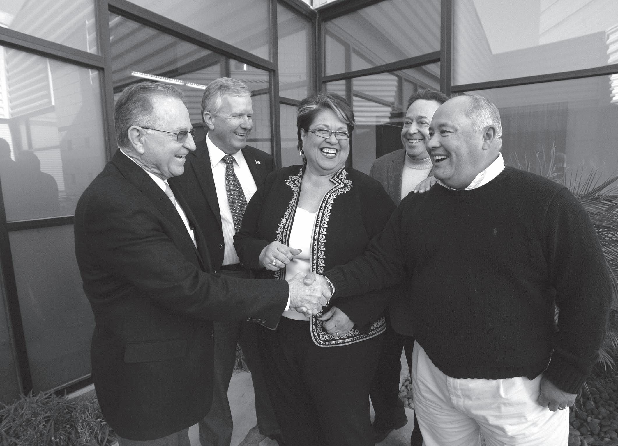 East meets west as Tolleson Mayor Adolfo Gamez, right, shakes hands with Buckeye Mayor Jackie Meck as Goodyear Mayor Joe Pizzillo, second from right, Avondale Mayor Marie Lopez Rogers and Litchfield Park Mayor Tom Schoaf look on.