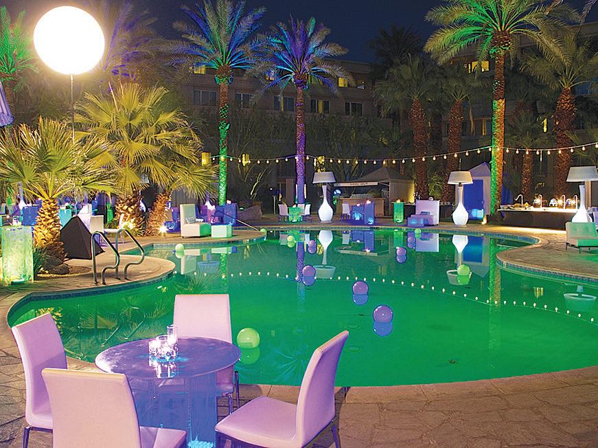 Clients often ask Kool to decorate their backyards or, in this case, hotel pool. The fi rm uses rechargeable wireless LED lights to eliminate cords.