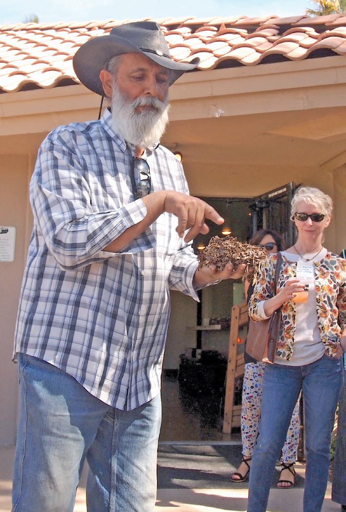 Holding up a large clump of earth, Singh explains to a visiting group from the Arizona Green Chamber of Commerce, “See that white material? When microbes die, they create humus; humus becomes a protein. That’s what gives soil texture and structure. If this is not here, then it’s man-made.
