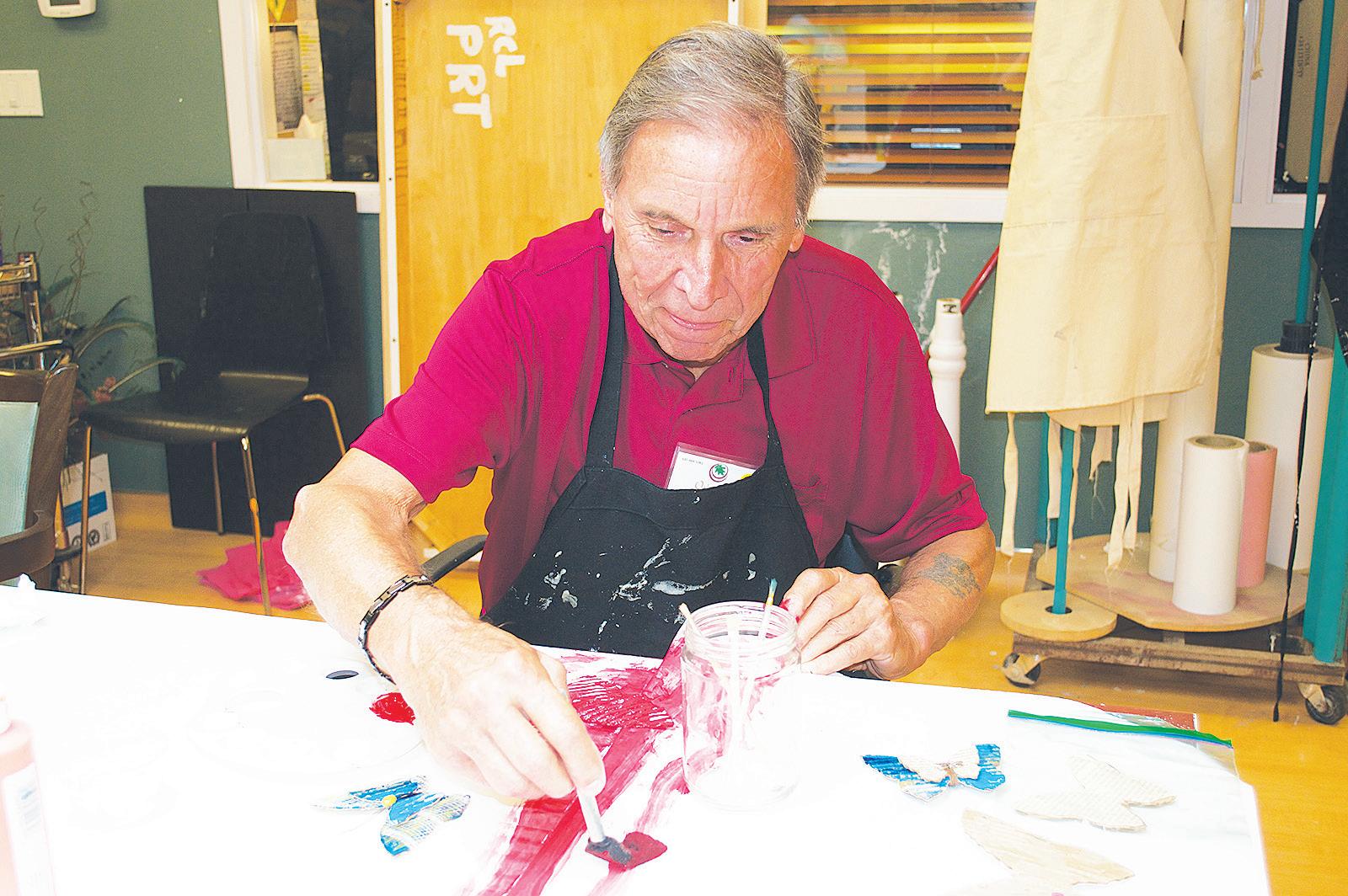 In an afternoon program, Chris energetically painted a corrugated cardboard butterfly red, as well as the table nearby. For over 15 minutes, he intensely worked on the project, assisted by creative engagement leader Jordyn Fani.