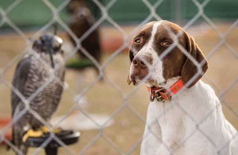 GRACE, AN ENGLISH POINTER, hangs out with the falcons Dec. 1 at the Falcon Force camp at Duncan Family Farms in Goodyear. The farm uses the falconry-based bird abatement business to help manage pests.