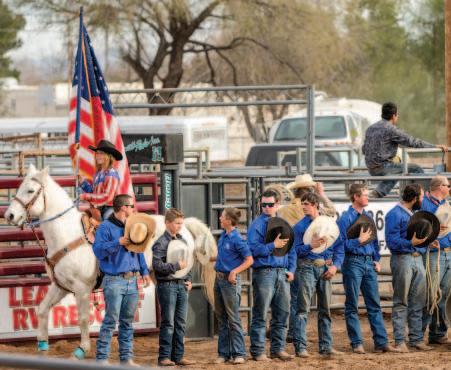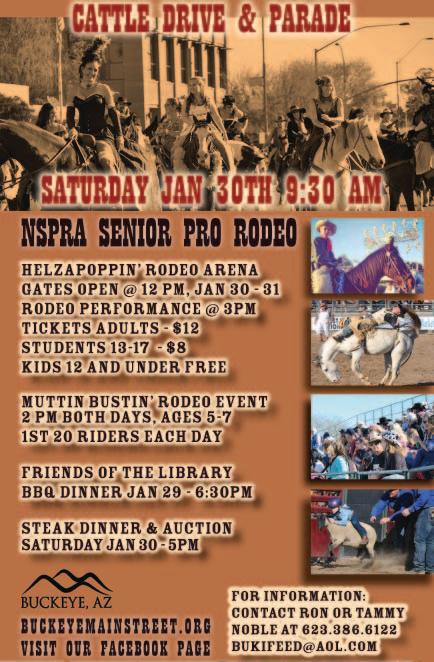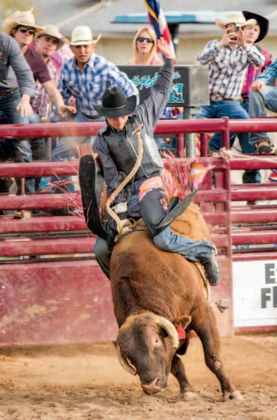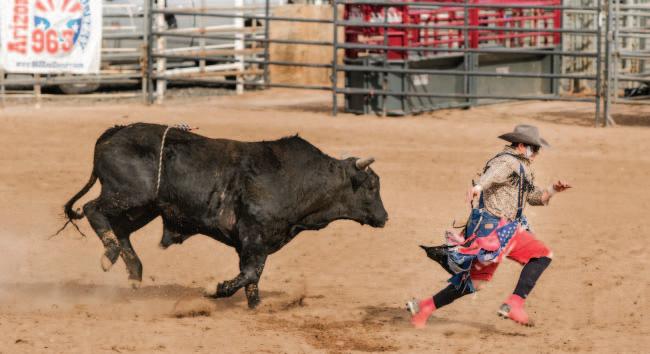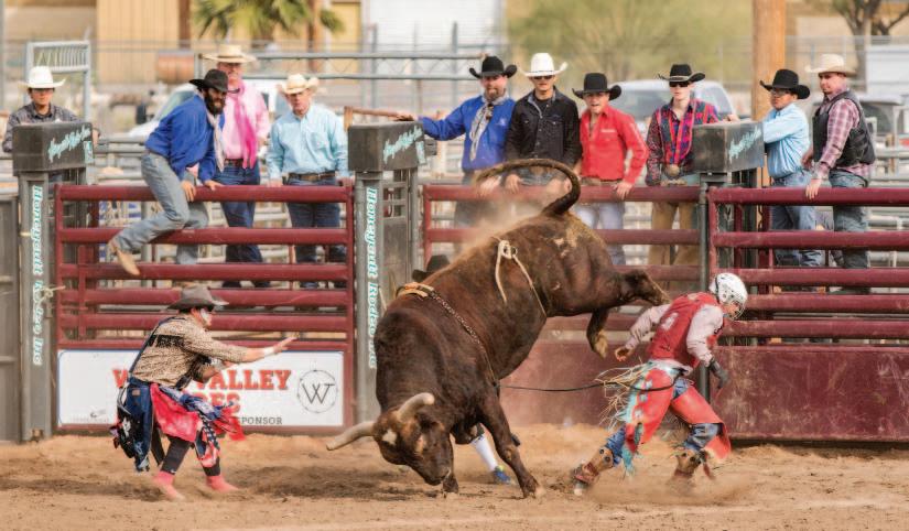 (ABOVE) A BUCKEYE BULL RIDER struggles to get his hand free after being thrown from the merciless bull “Ironhide” Jan. 23 at the Bulls & Sheep event at Helzapoppin’ Rodeo Arena in Bu ckeye.