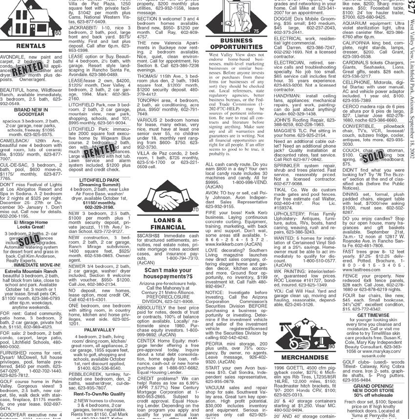HOUSECLEANING. Valley wide. Honest. Detailed. Reliable. 17 years experience. References Available. 602-481-8627. PERSONAL touch cleaning without crew, servicing Litchfield Park, Verrado, Estrella Mountain and Goodyear, weekly & biweekly special, Call Robin 623-853-5324.