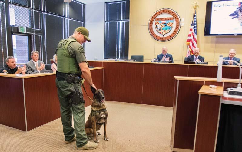 BUCKEYE POLICE OFFICER Dave Smith stands with his K-9 partner, Cido, during the 10-year-old Belgian Malinois’ retirement ceremony July 5 at Buckeye City Hall. Cido, who was honored for his eight years of work with the Buckeye Police Department and S.W.A.T, will spend his retirement by joining Smith’s family full time. To see all photos from this shoot, go to www.westvalleyview.com/pictures.