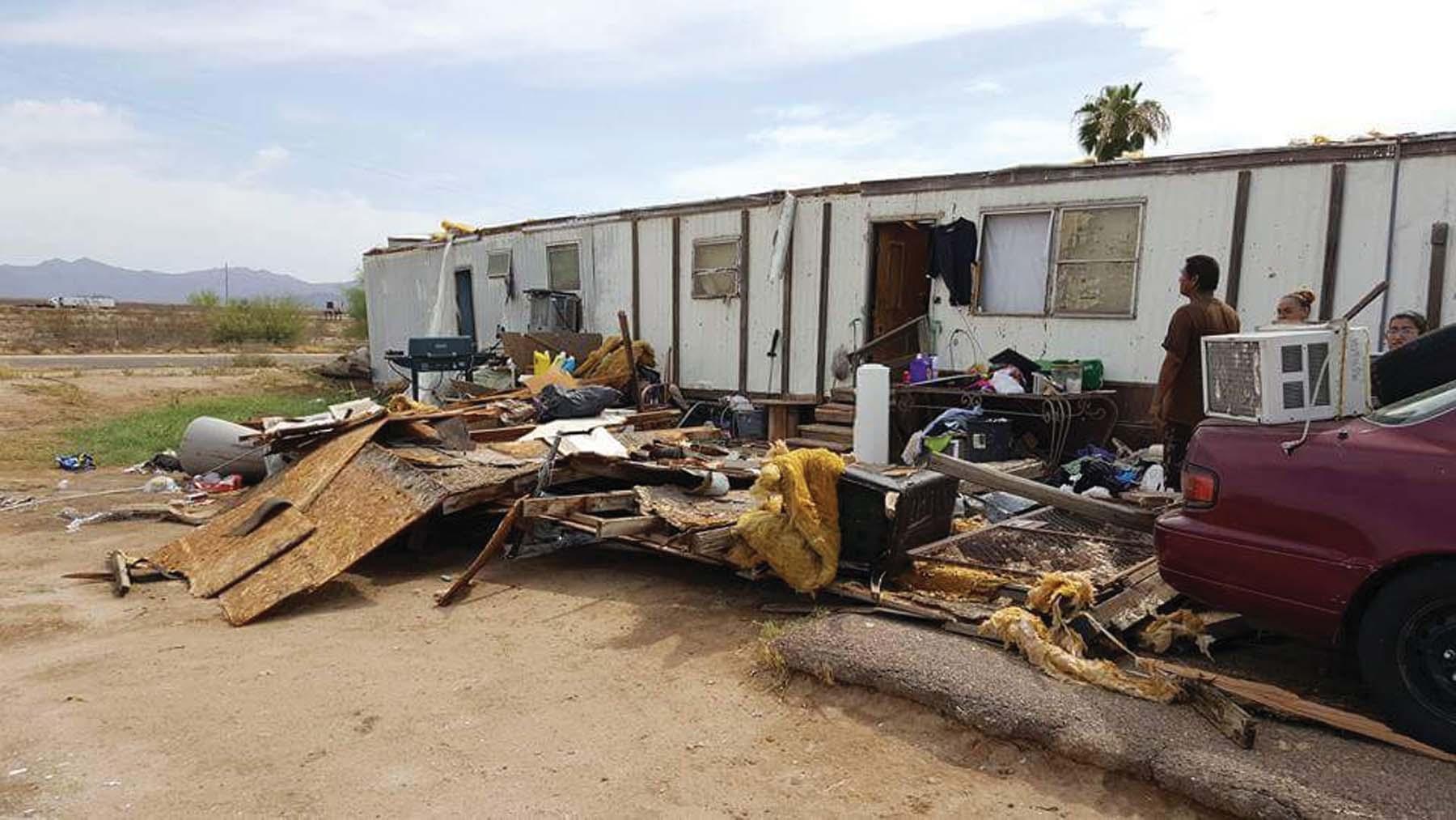 RESIDENTS OF THE HOPEVILLE COMMUNITY in Buckeye survey the damage to their trailer after a massive storm swept through the area July 29. Officials are calling it the worst storm in five years, with reported wind gusts of 80 mph.