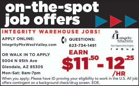 Seasonal Labor needed October, November and December General Labor Rolling stock Candidates apply in person at OLAM COTTON 25500 W Southern Ave., Buckeye, AZ WAREHOUSE LABOR In Southwest Phoenix. Available shifts MondayFriday 5:00p.m.3:30a.m.; SaturdayMonday 6:00a.m.6:30p.m., SaturdayMonday 6:00p.m.6:30a.m. $11.25 an hour. Call 623-552-3250
