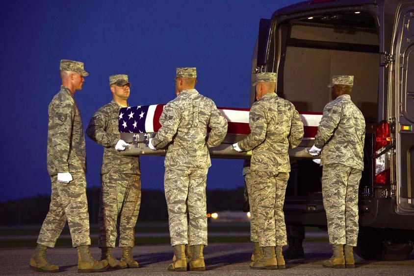 AIRMEN CARRY THE REMAINS OF MAJ. TROY GILBERT Oct. 3 at Dover Air Force Base in Dover, Del. Gilbert died Nov. 27, 2006, when his F-16 crashed while he was providing close-air support to special operations forces about 20 miles northwest of Balad Air Base in Iraq.