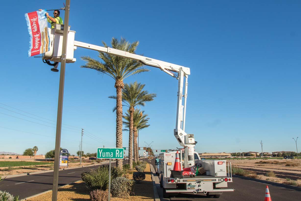 CITY OF GOODYEAR EMPLOYEE GABE SOTO hangs a holiday sign from a light pole along Estrella Parkway Nov. 18 in Goodyear. Holiday-themed signs have been hung on light poles throughout the city and will remain in place through early January.