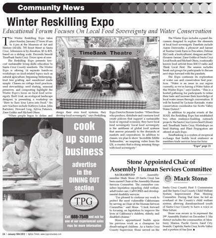 he Winter Reskilling Expo takes place Sunday, January 27 from 10 am to 4 pm at the Museum of Art and History (MAH), 705 Front Street in Santa Cruz. Admission is by donation, $5 to $25, based on a sliding scale. Proceeds benefit TimeBank Santa Cruz. Doors open at nine. The Reskilling Expo presents lowcost sustainable living-skills education to Santa Cruz County residents. The Winter Expo is offering 14 separate hands-on workshops on food-related topics such as natural agriculture, beginning beekeeping, fruit tree grafting and sauerkraut made simple. Classes on cottage food practices, seed stewardship, seed starting, seasonal preserves, and composting highlight the Winter Expo’s focus on local food sovereignty. Brett Graf, an ecological landscape designer, is presenting a workshop on “How to Turn Your Lawn into Food.” Six new teachers include Kathryn Lukas, John Bartolero, Howard Ling, Sylvia Patience, Zane Griffin and Michael Olson. “When people begin to define and