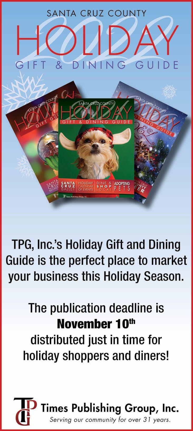 The Santa Cruz County Animal Shelter has hundreds of adoptable animals looking for their forever home. Now through Oct. 31, all shelter pets will be available for a ‘Pay it Forward’ donation. The suggested donation is between $20-$200 and adopters can target their donation: Planned Pethood Fund (low cost/free spay/ neuter) or Extra Mile Fund (spe-cialty lifesaving procedures for homeless animals).