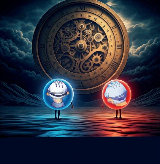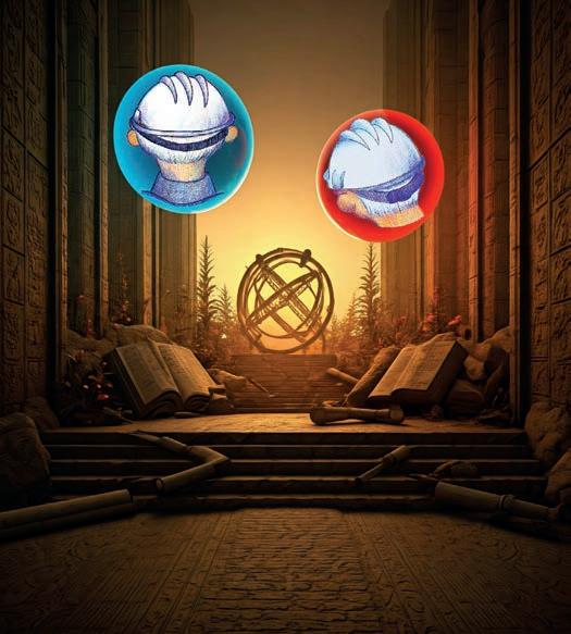LAPORTADELTEMPO Inunpaesaggioonirico,surreale,duesferedicolorediverso fluttuanosopraunsentierotortuosochesiestendeverso l’orizzonte.Lascena avvoltadaunanebbialeggera,con sfumature blu oro mescolano.Le sfere,una