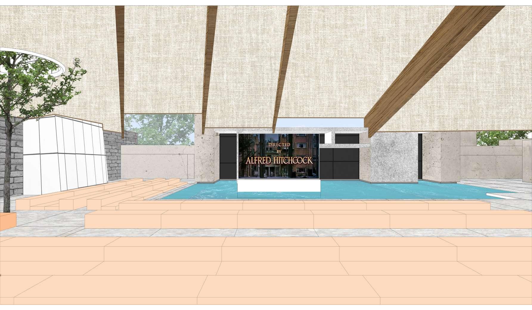 The floor plan optimizes movement circulation, integrating a temporary pool platform to enlarge the courtyard’s capacity. Positioned atop this platform, the elevated screen enhances ambiance while providing relief from scorching summer temperatures. This innovative design caters to both functionality and atmosphere, offering an immersive cinematic experience amidst natural cooling elements