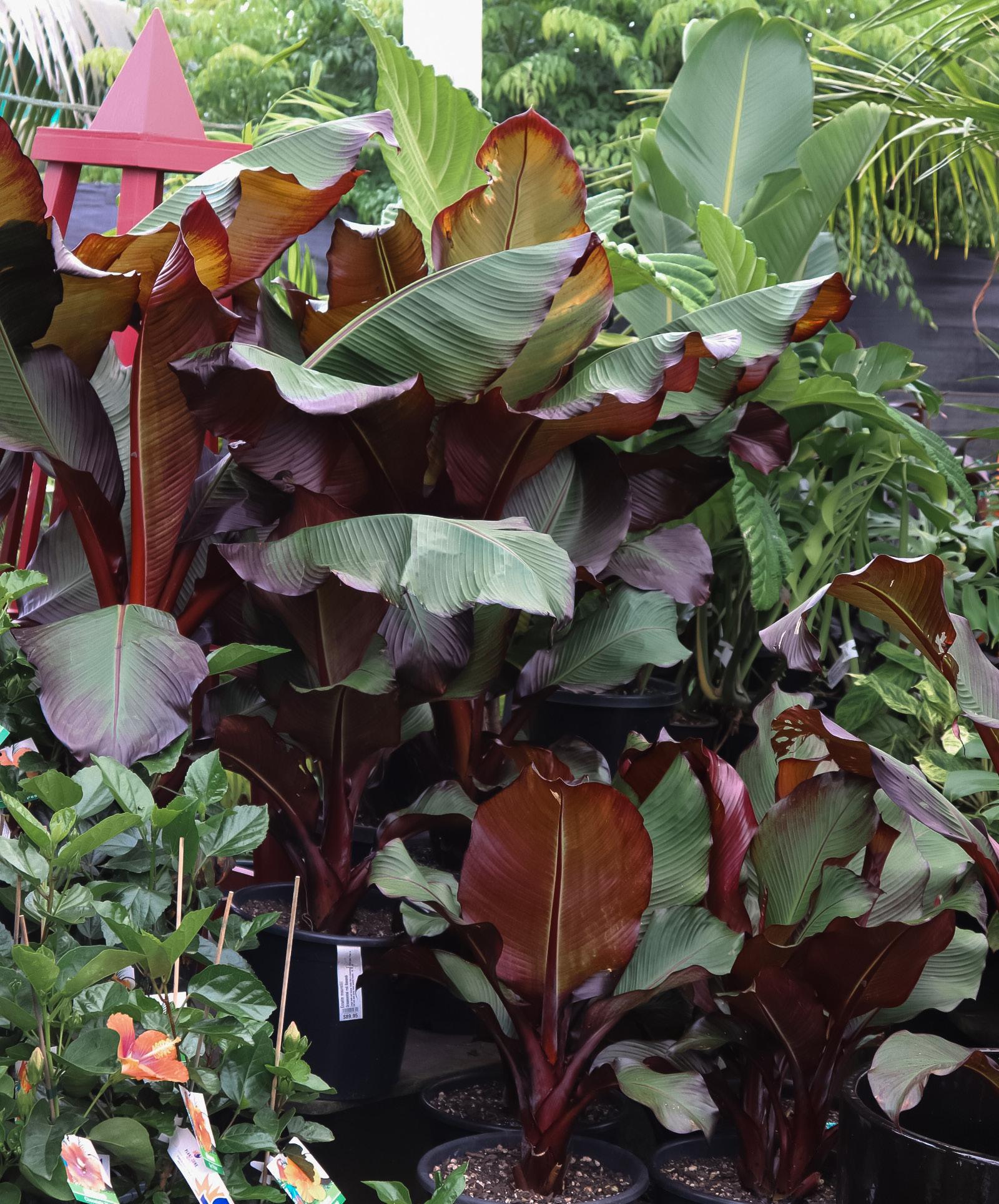 Reddish-purple, glossy, broad foliage; perfect for a lush, tropical appearance, with flowers appearing in spring on mature plants. 6L