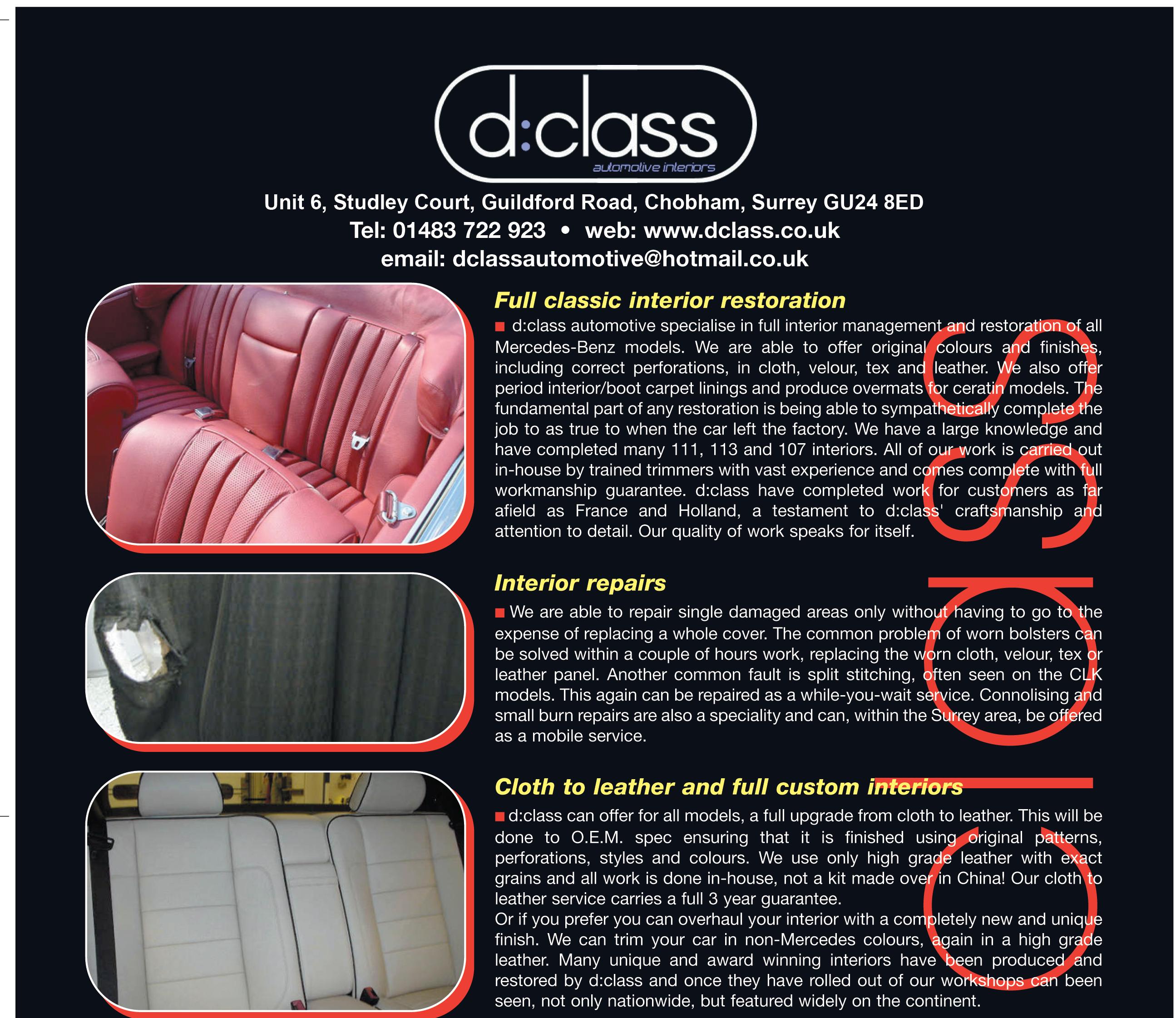 d:class automotive specialise in full interior management and restoration of all classic cars. Our knowledge is second to none in supplying period correct carpets, leather or vinyl.