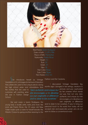 She introduces herself as Vintage Fashion and the Creativity. Vandalizm or V.V., «Vintage» for her love of Salvation I discovered Vintage Vandalizm few Army where she used to find unique pieces during her high school years and «Vandalizm» from months ago; I plunged in her writings, creations & the clothes that she used to “she’s authentic and unique, but pictures and was captivated customize with painting when she encourages us to develop by her universe. What stands out was that not only she’s she was in Fashion Design our own originality or difference authentic and unique, but she School. and to dare to be ourselves.“ encourages us to develop our own originality or difference Her real name is Jasmin Rodriguez; this young lady is model, writer, stylist....and more. Her and to dare to be ourselves. A way to bring our roots are Puerto Rican, the 23 years old New personal touch to this world that today still not Yorker made quite a name for herself besides the accepts men and especially women who do not Atlantic Ocean by giving another meaning to the want to follow a conventional road.
