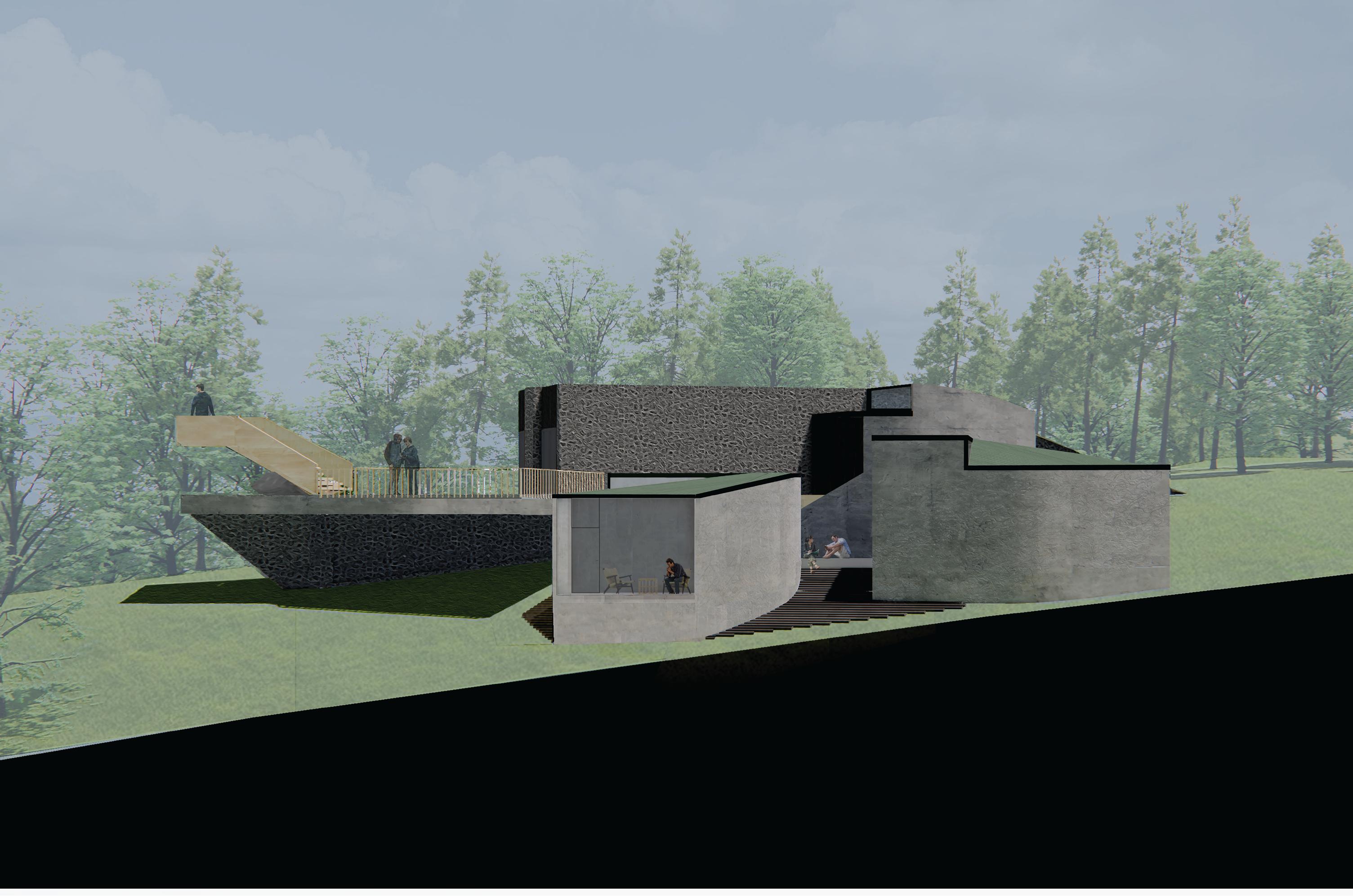 The wall brings growth from the forest into the space. Static areas follow the natural terrain