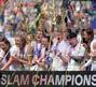 A destra, Francesco Zambelli, presidente del club rossoblù, festeggia con i giocatori la conquista del quattordicesimo scudetto del Rovigo.