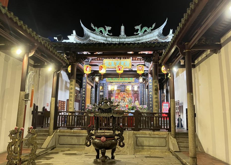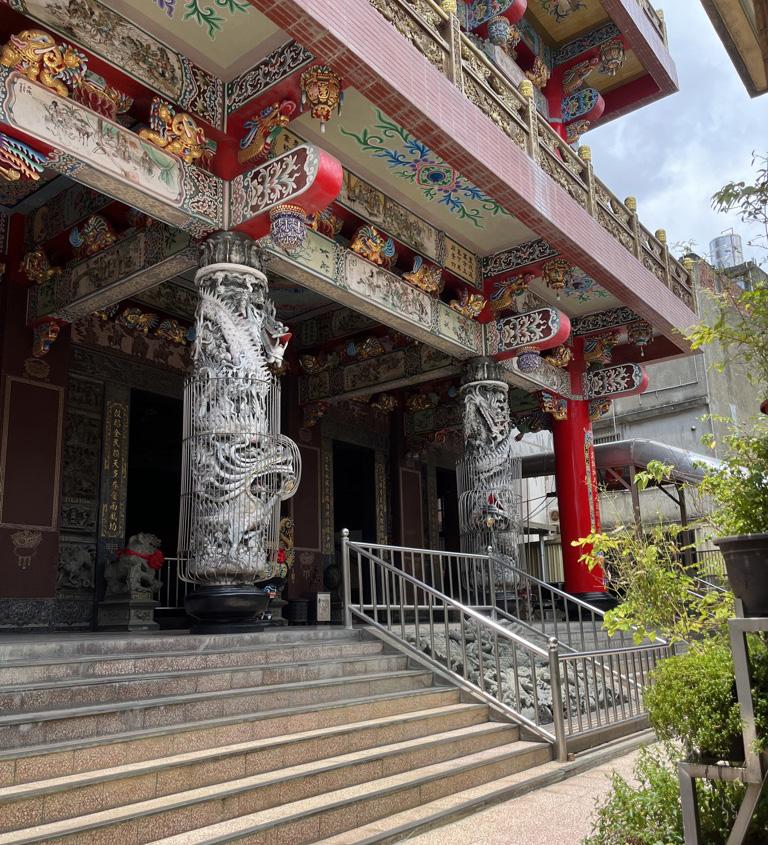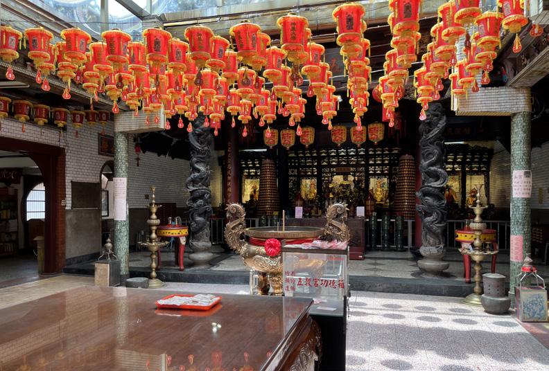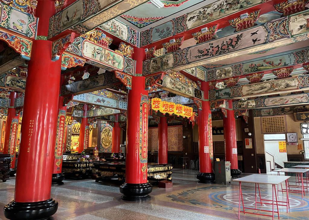 中間擺放大型供桌,就像許多廟宇一樣,雕龍 畫柱,尤其往神明那邊望去,金碧輝煌,然而 不同的是,沒有四溢濃烈的燒香味。