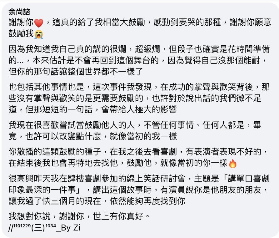 「你散播的這顆鼓勵的種子,在我 之後去看喜劇,有表演者表現不好