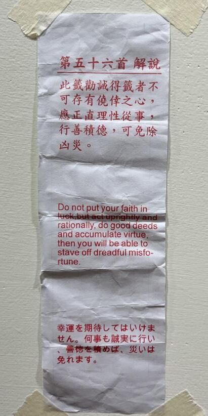 我抽出第五十六首籤,丟擲丟擲丟擲,連續成 功三次,到小抽屜拿籤詩,這時瞥見「下下」