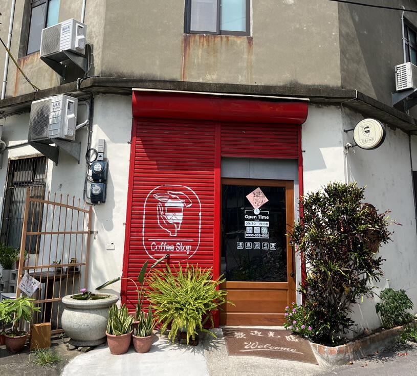 巷弄的三角匯集處,亮紅的鐵捲門漆著白色
