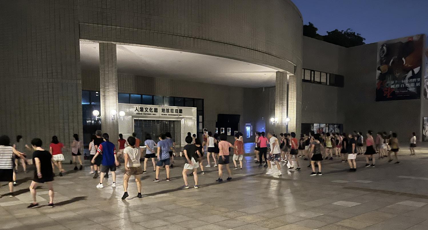 沿著草悟道走到自然科學博物館,剛好在廣場 前看到五六十人跳廣場舞,耳朵被音樂勾起, 很喜歡當下的律動感,所以中場休息時,我上 前詢問阿姨怎麼加入,阿姨明快地把我介紹給 帶團的舞蹈老師。