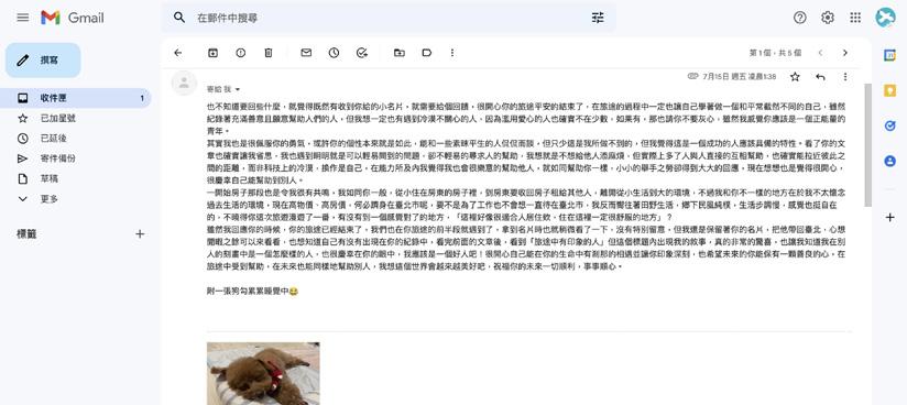 直到八月初,那陣子也不知道為什麼就下意識 地想要點開信箱,結果跳出新通知—— 7/15 凌 晨寄出的信,我旅行結束一個禮拜後。裡頭最 讓我感動的是這兩段話: