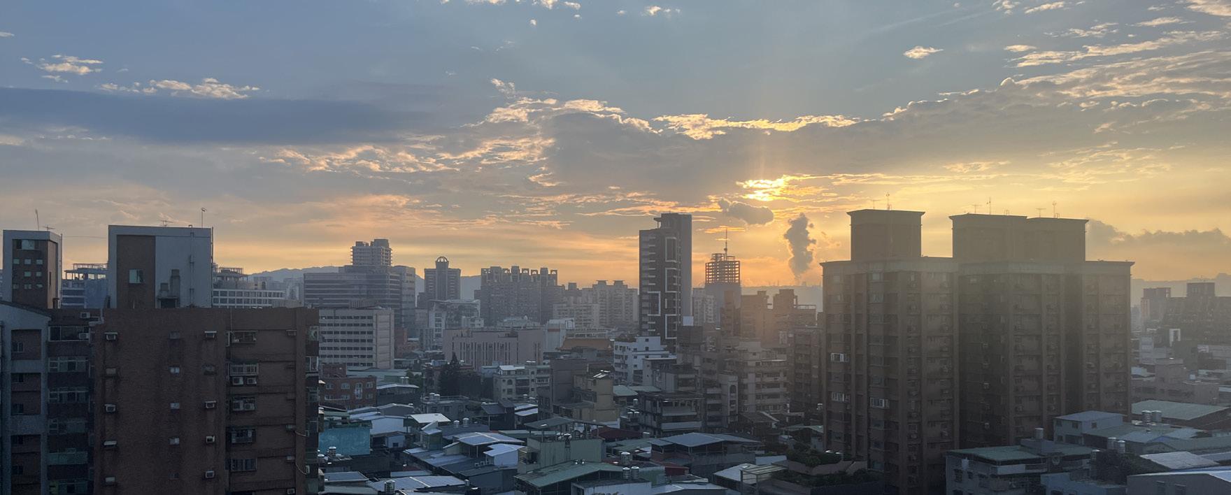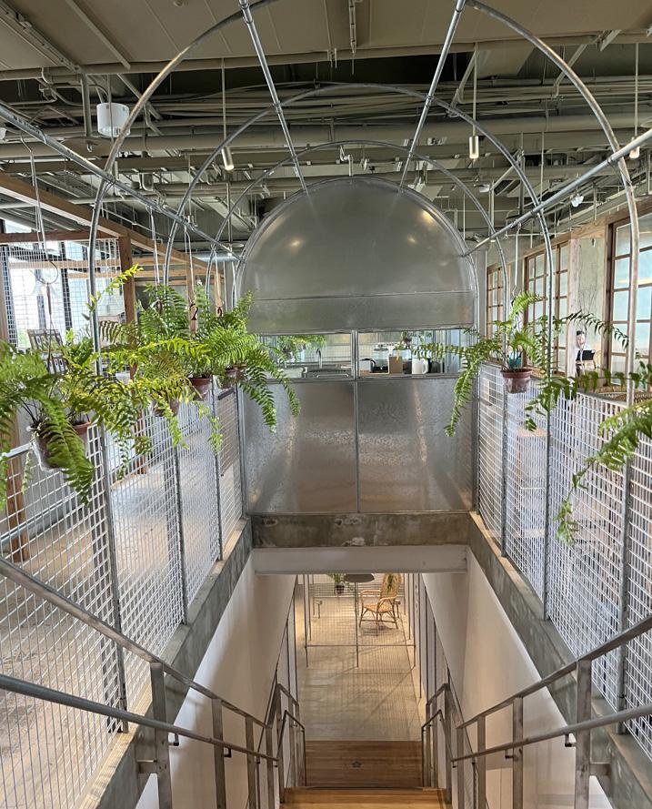 呼應台中做為花園城市的意象,中間走道搭起 長方形棚架懸掛台灣原生種植栽,繼續往前看, 挑高的木頭地板,擺設的藤椅與木頭紋圓桌為 環境染上大地色彩,視線最後停在整排的落地 窗,午後太陽在地板上曬出斜斜長長的影子。