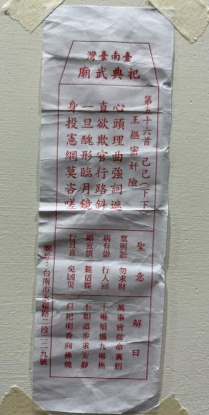 晚上八點多路過台南祀典武廟,廟裏左方櫃子 數字從一到七八十,每個小抽屜對應一個號碼, 裡頭放著一疊籤詩,祭拜桌前放了好幾支筊, 筊旁邊則有大籤筒,每支籤長一尺以上。「你 要先告訴神明你是誰,想問什麼問題,接著擲 筊一正一反,表示神明同意你能抽籤。」一旁 的阿姨看我困惑的樣子,隨即補充,「抽完籤 還要連丟三次,都是聖筊代表就是那支籤,但 只要有一次笑筊,就需換籤。」