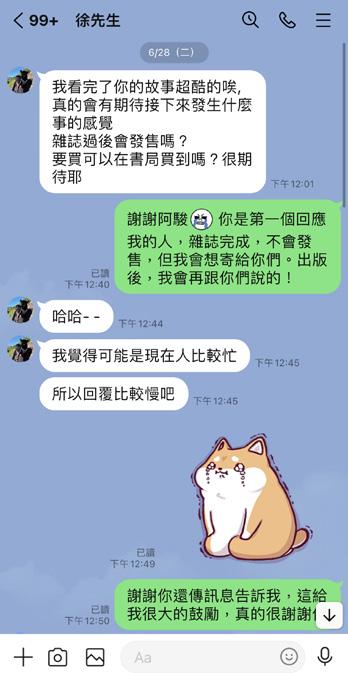 12月底,有天手機突然跳出通知,當下覺得奇 怪,為什麼這麼久以前的文章還有人留言回覆, 點開立刻發現是他:「因為我知道我自己真的 講的很爛,超級爛,但段子也確實是花時間準 備的...,本來估計是不會再回到這個舞台的, 因為覺得自己沒那個能耐,但你的那句話讓整 個世界都不一樣了。」他說,