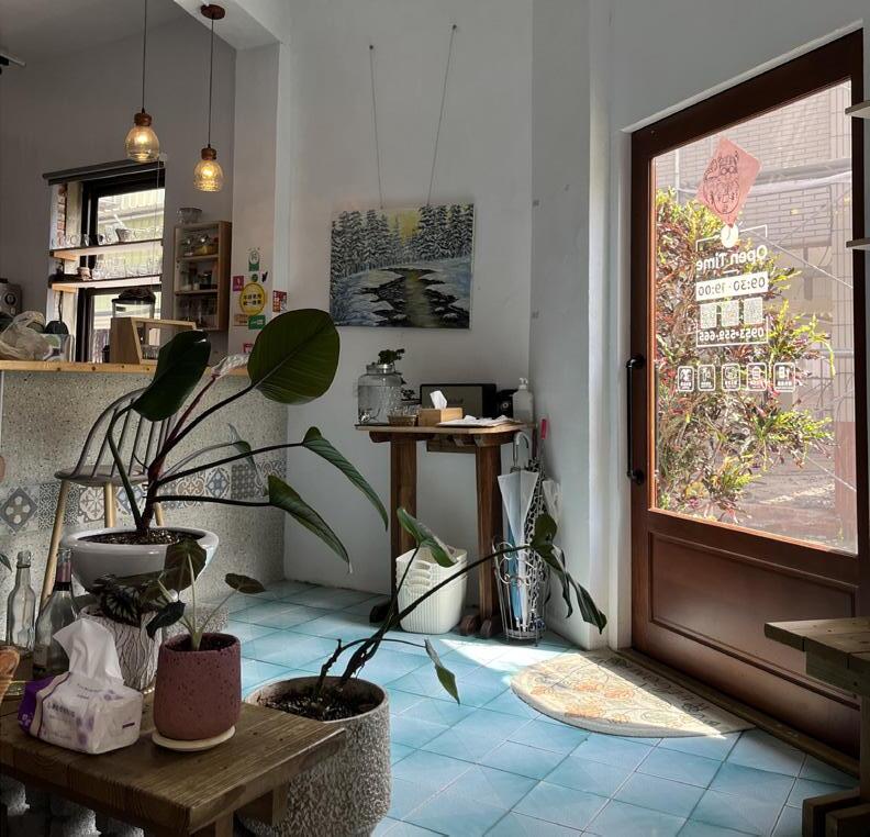 掛式橙黃色燈泡與外頭艷陽形成對比,右側則 是釘在牆壁的三層木頭架,擺著小巧咖啡壺、