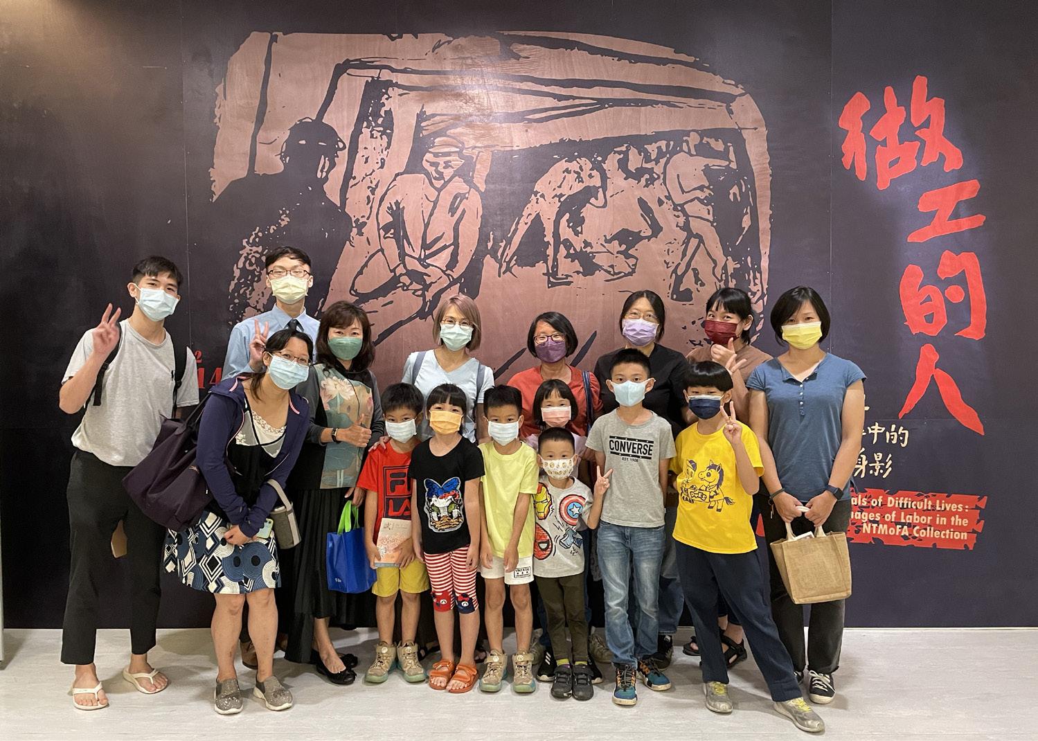 現場大人加小孩共十四、十五位。這群媽媽每週會定期來這邊聽導覽,當我猶豫著是否可以跟導覽時,一位側背著茄芷袋(藍 綠紅三色手提袋)的阿姨注意到我,說著:「一起來聽阿!」導覽結束後她邀我跟所有人一起拍照,於是就有了這張照片。