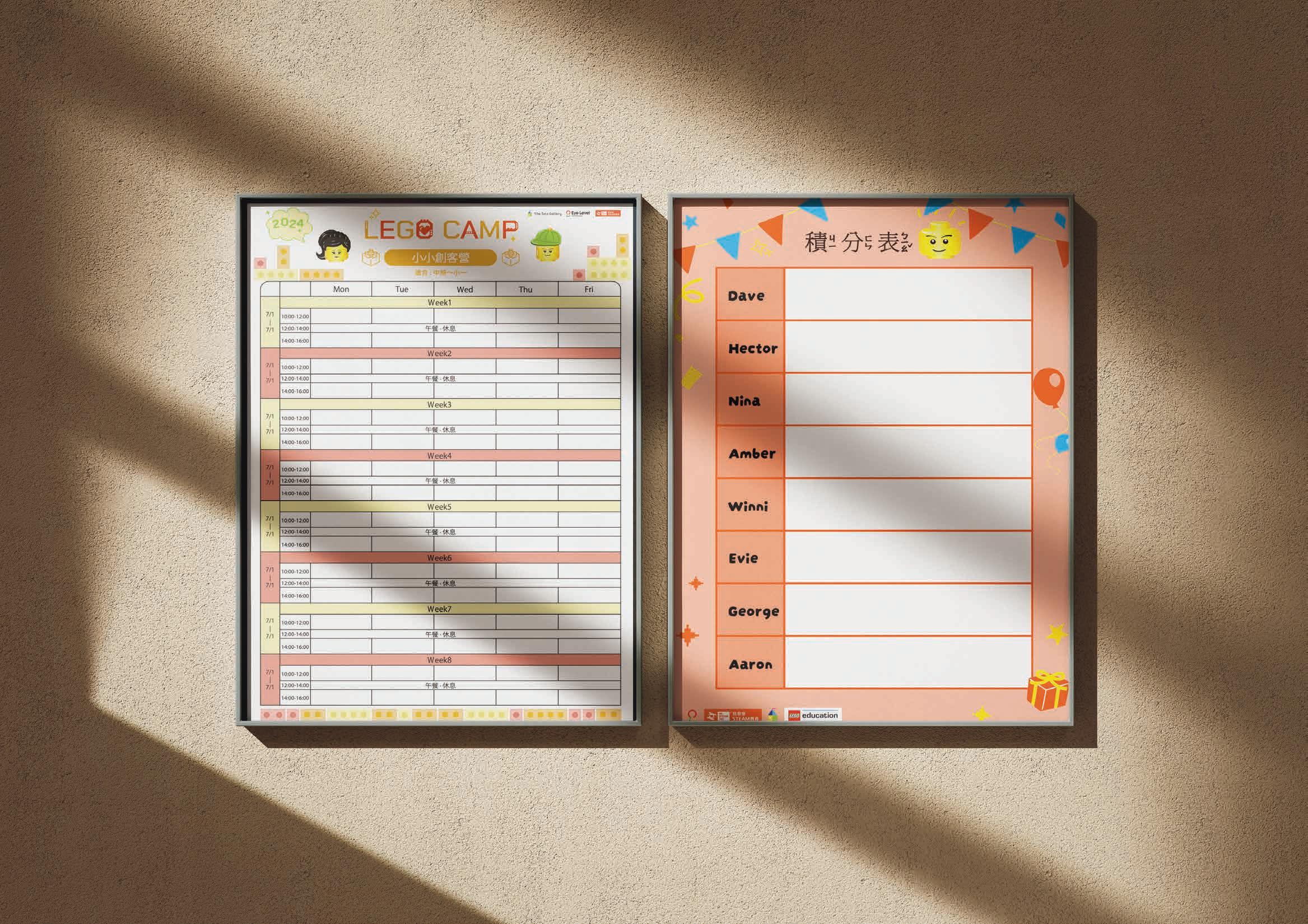 圖片為補習班課表、課輔積分表設計 以繽紛的樂高人和樂高裝飾版面。