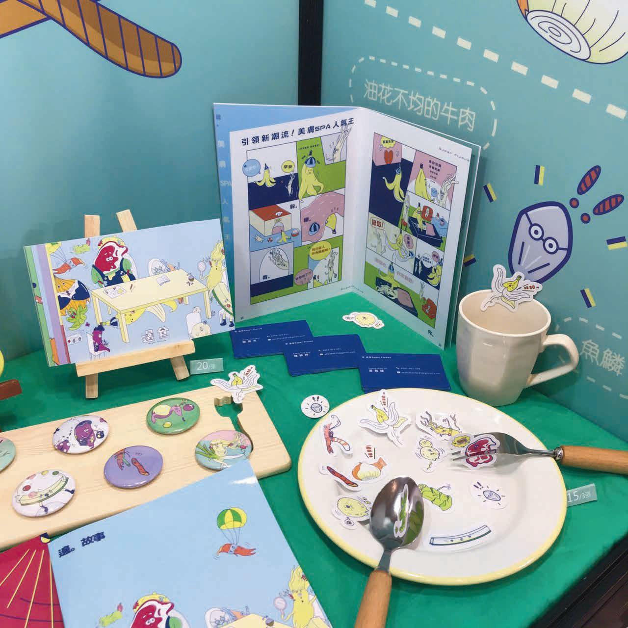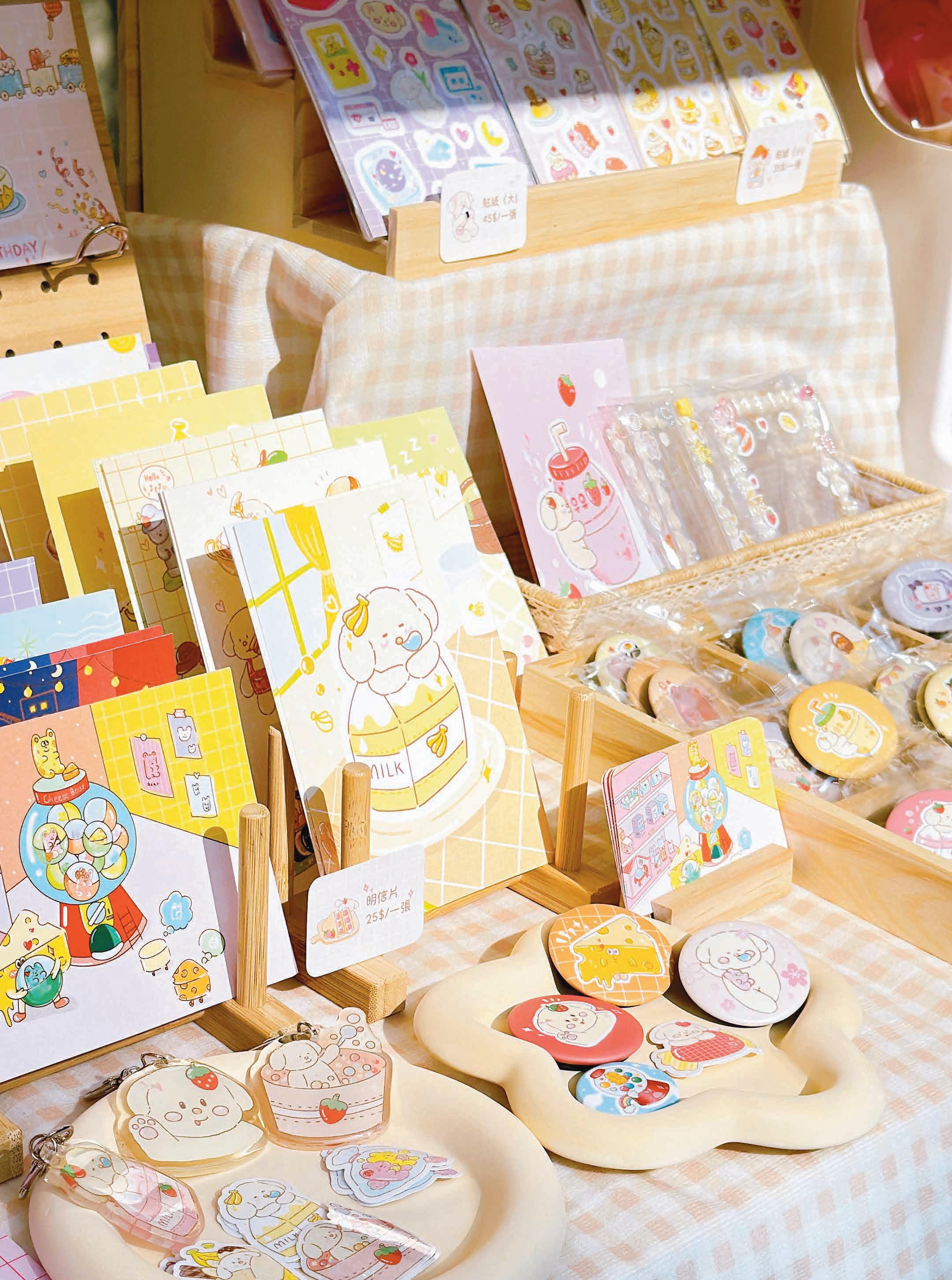 信片、胸章、貼紙.....等產品,希望可以透過 粉嫩的色彩、溫暖的插畫療癒大家的心。