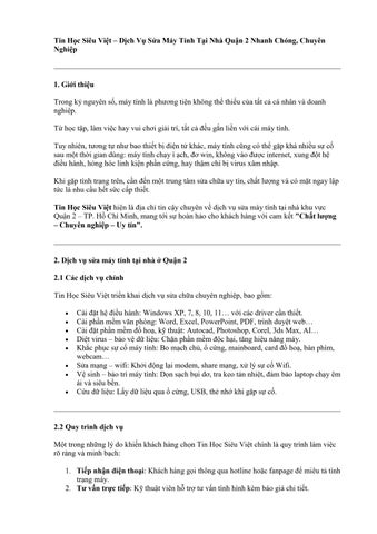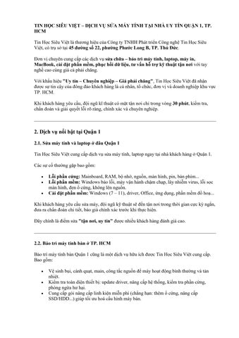 Tin Học Siêu Việt chuyên cung cấp dịch vụ sửa máy tính tại nhà, máy in, lắp đặt camera, sửa chữa cài đặt macbook, dịch vụ cứu dữ liệu, thiết kế Website, đào tạo SEO.Với thời đại công nghệ phát triển như hiện nay, máy tính là công cụ đắc lực không thể thiếu trong công việc và trong học tập. Trong quá trình xử dụng lâu dài, nếu không kiểm tra bảo dưỡng thường xuyên các thiết bị văn phòng, rất dễ gây ra các tình trang hư hỏng nếu không sửa chữa kịp thời chắc chắn sẽ ảnh hưởng đến công việc của bạn, cũng như chi phí sửa chữa nhưng bây giờ bạn hãy yên tâm đã có dịch vụ sửa chữa tại nhà chủa chúng tôi. Với đội ngũ kỹ thuật giàu kinh nghiệm chuyên sửa chữa, bảo dưỡng các thiết bị máy móc văn phòng với chi phí rẻ nhất, nhanh nhất. TIN HỌC SIÊU VIỆT cam kết sẽ cung cấp cho khách hàng dịch vụ tốt nhất với giá cả cạnh tranh nhất . Thông tin liên hệ: Tin Học Siêu Việt Địa chỉ: 45 Đường Số 22, Phước Long B, Thành Phố Thủ Đức, Thành phố Hồ Chí Minh SĐT: 0976086500 Website: https://itsieuviet.com/