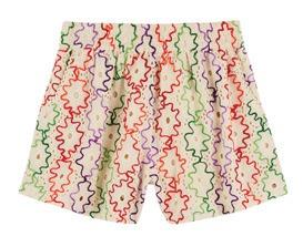 La veste Joseph appartient à un adorable trio de pièces confectionnées en une gaze de coton. Elle se compose d’un double fond sur lequel se superpose une resille entièrement brodée de formes losangées, de pétales, d’étoiles stylisées en forme de pompons rasés: une matière à l’allure de tapisserie indienne très bohème